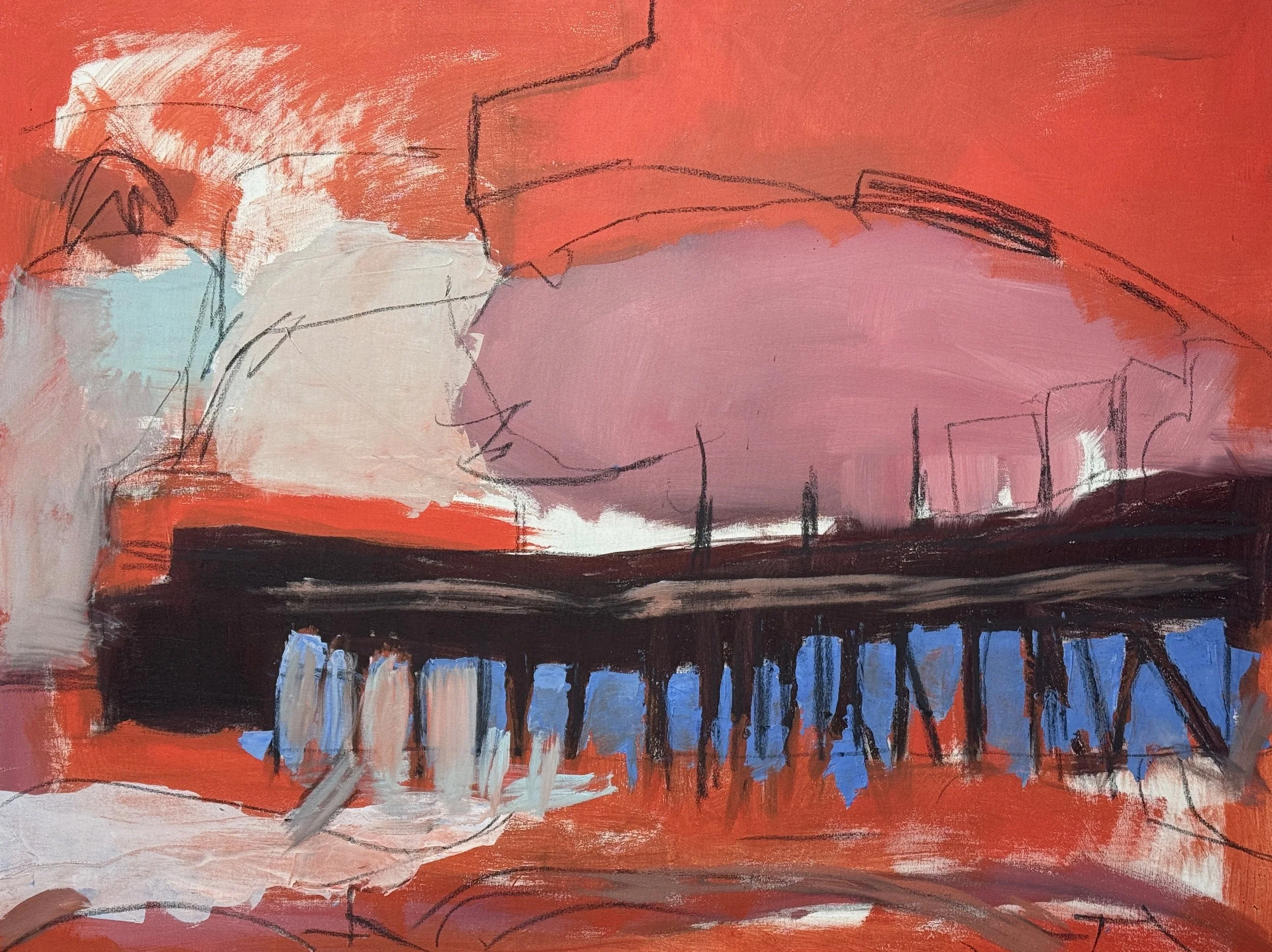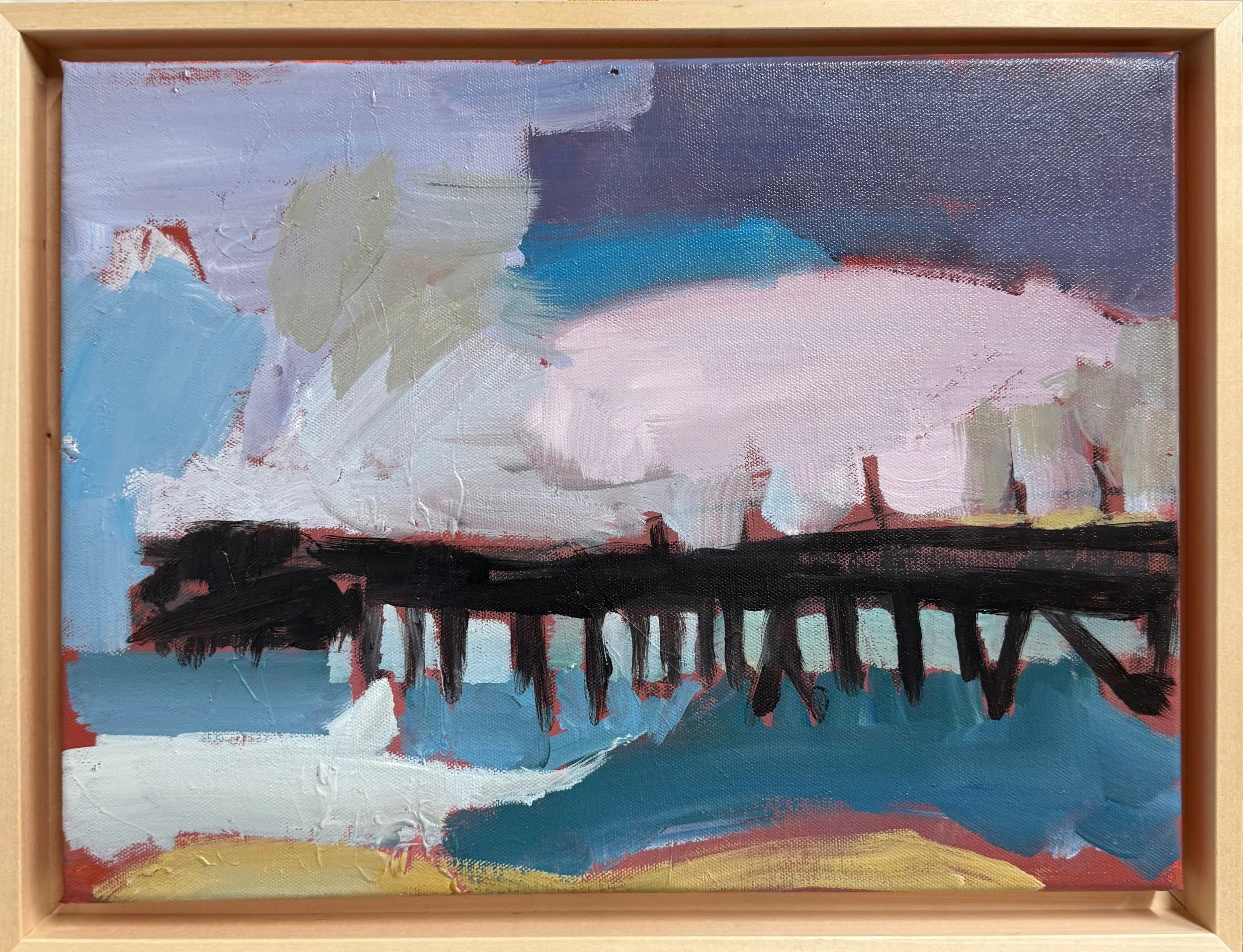 Deal Pier, acrylic on canvas, 30 × 40 cm. Presented in a simple wooden floating stretcher frame. Shipping is additional and calculated based on your location.