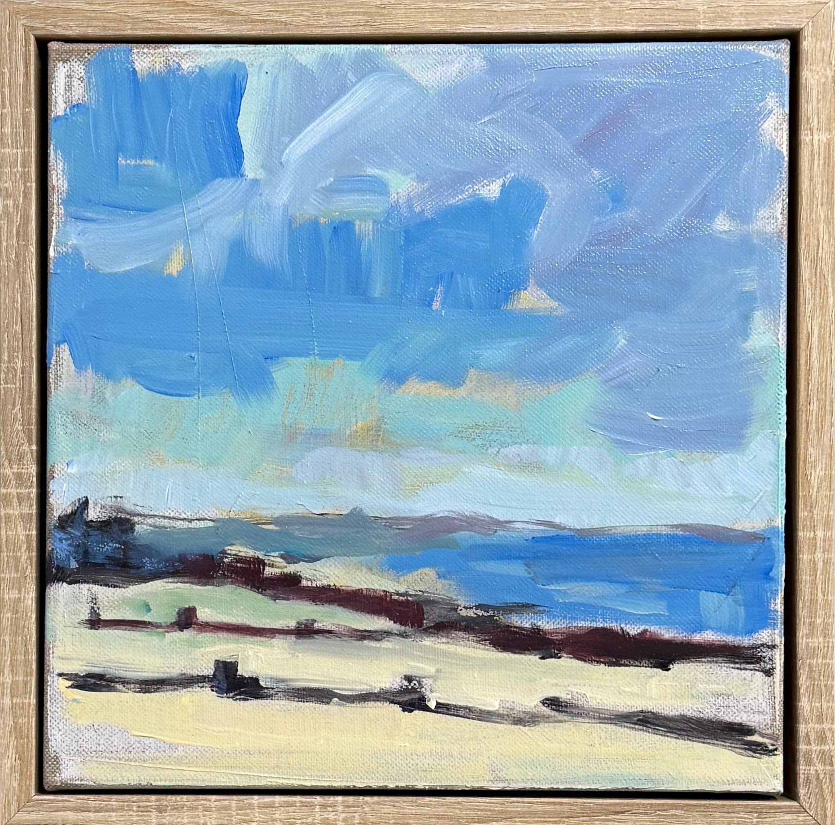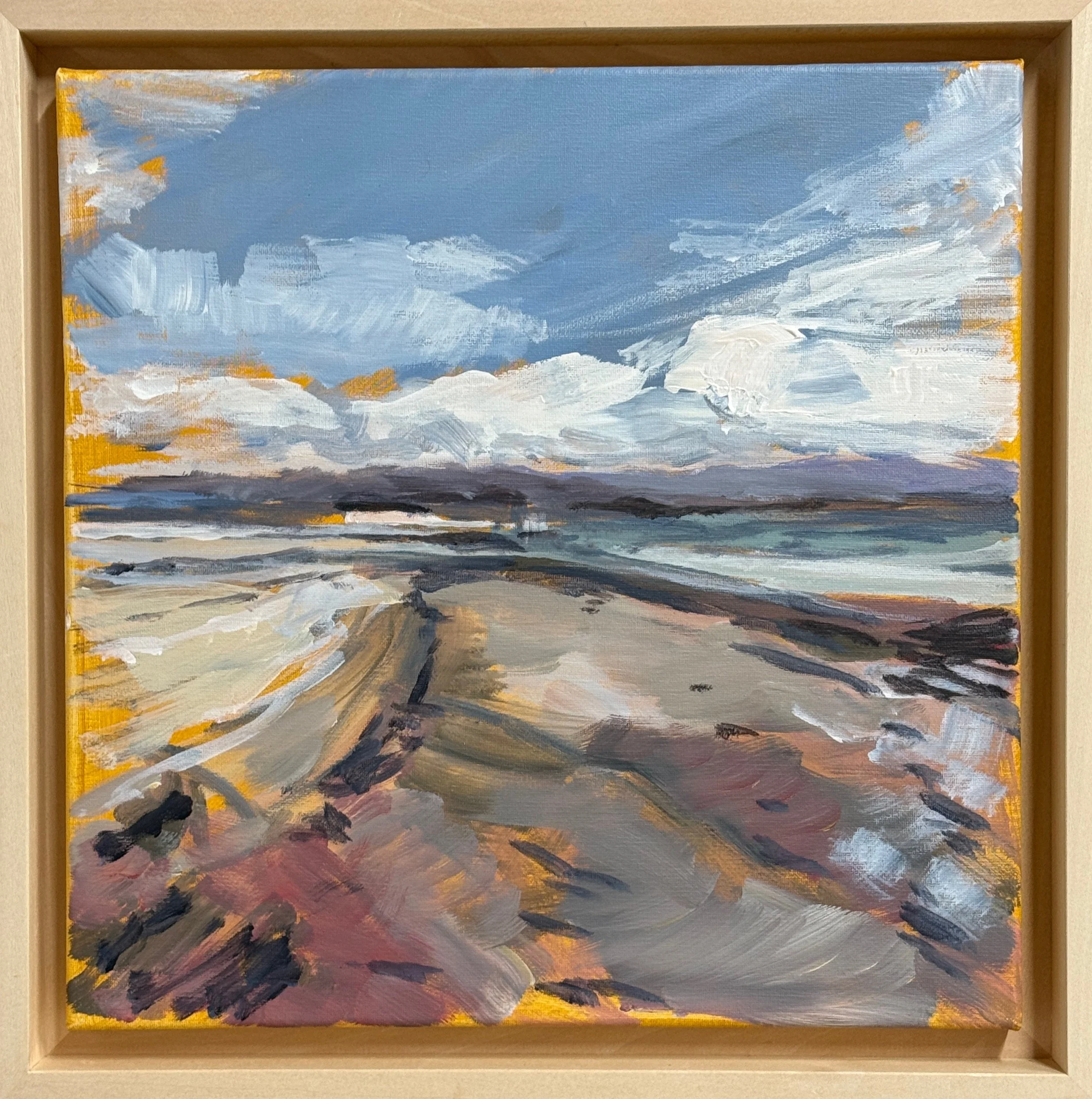 A coastal acrylic painting capturing the sky and shoreline of Whitstable Bay. Acrylic on linen, 30 × 30 cm, framed in a simple wooden floating stretcher frame. Shipping is additional and calculated based on your location.